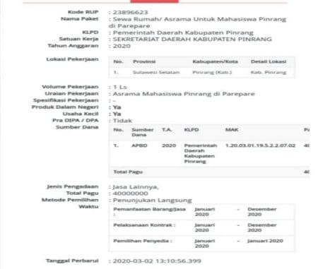 PINRANG, PIJARNEWS.COM–Pemerintah Kabupaten Pinrang sebelumnya menganggarkan pengadaan asrama mahasiswa Pinrang di Parepare yang nilainya sekira Rp 40 juta. Namun ternyata proyek tersebut dibatalkan, hal itu di ungkapkan Sekretaris Daerah Kabupaten Pinrang, Ir. Budaya, saat di hubungi, Rabu (2/12/2020).