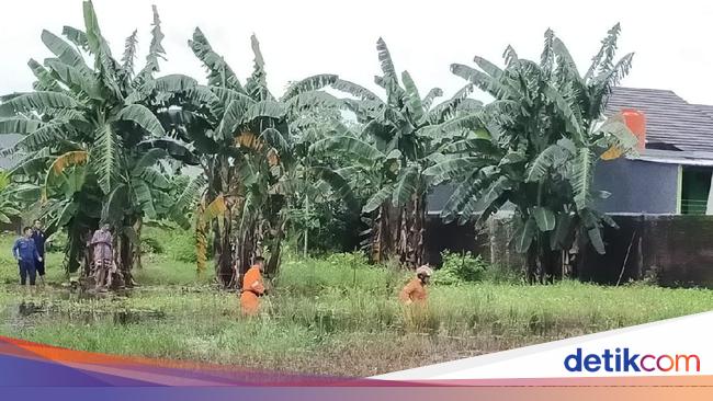 Pantauan detikcom di wilayah tergenang air di belakang permukiman warga di Jalan Tamangapa Raya, Kecamatan Manggala, Kota Makassar, Rabu (20/1/2021), tampak petugas damkar yang menerima laporan warga tengah mencari buaya.