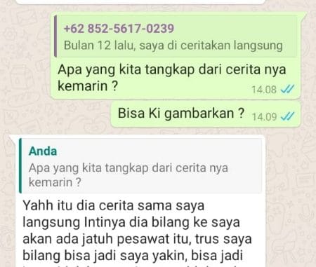 Namun setelah pemeberitaan jatuhnya pesawat Sriwijaya Air 182 itu ia kemudian sadar pasca Rustam mengingatkannya lewat chat tentang mimpi yang diceritakan persis dengan kejadian itu.