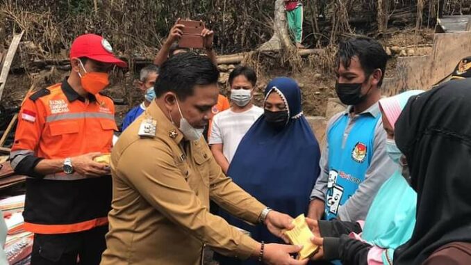 Wabup Asman datang langsung dan menyerahkan bantuan berupa barang dan uang tunai didampingi oleh jajaran Dinas Sosial, BPBD, Baznas dan Camat Buntu Batu.